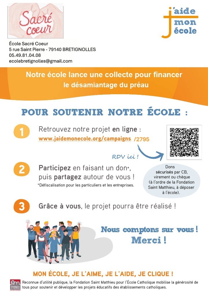 L’école Sacré-Cœur a besoin de vous ! Afin de financer le désamiantage du préau et sa rénovation, nous lançons un appel à la solidarité.