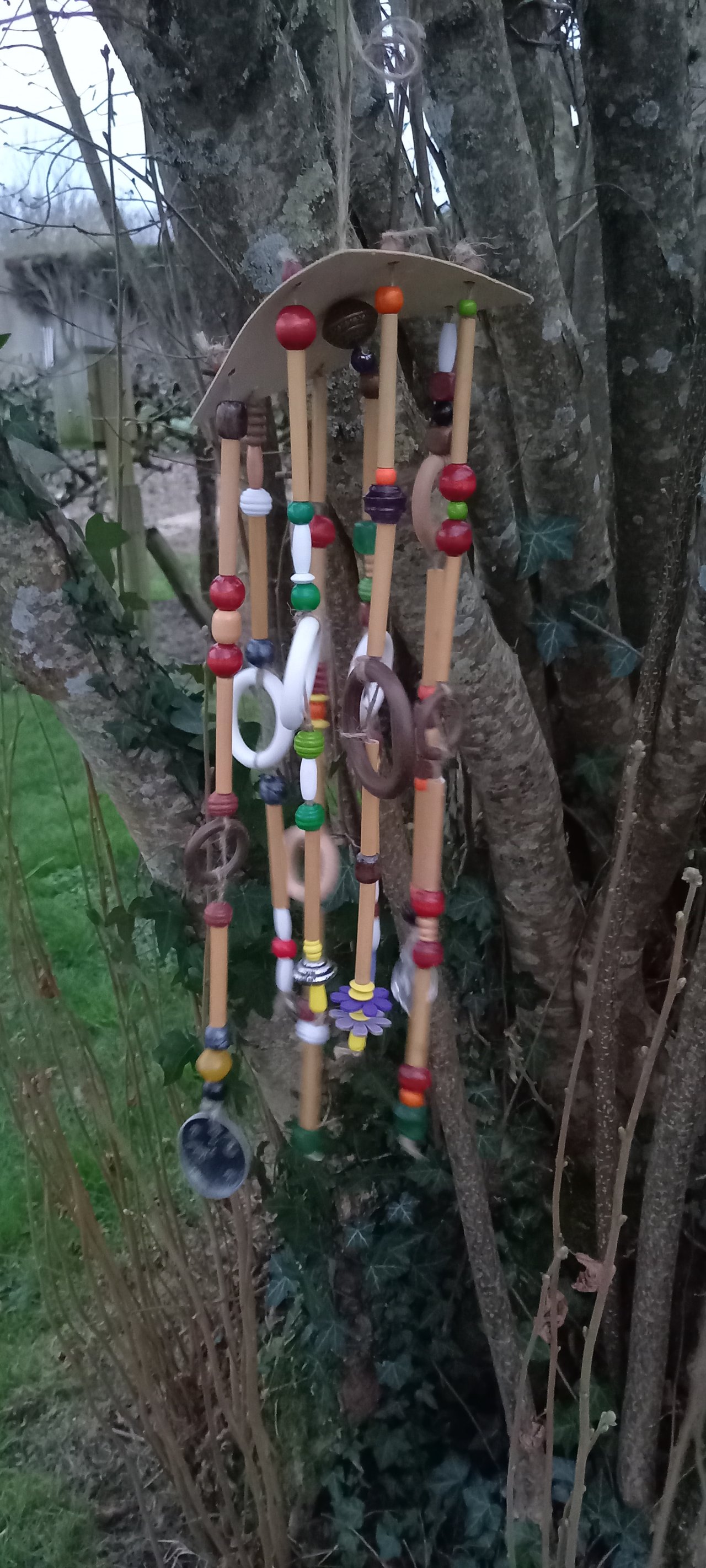 Un mobile de jardin: prévoir : des anciens anneaux de rideaux,