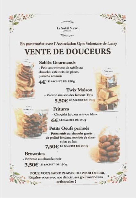 "Le Soleil Sucré" vous propose une vente de douceurs, en partenariat avec l'association "Gym Volontaire de Luzay"